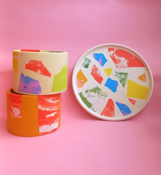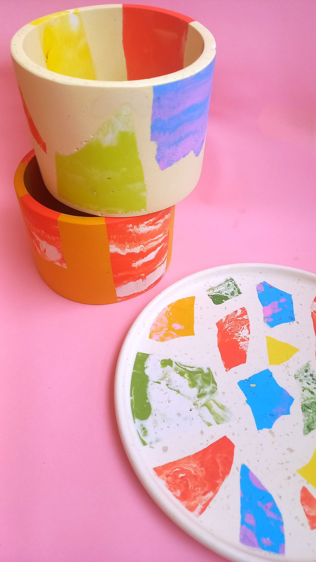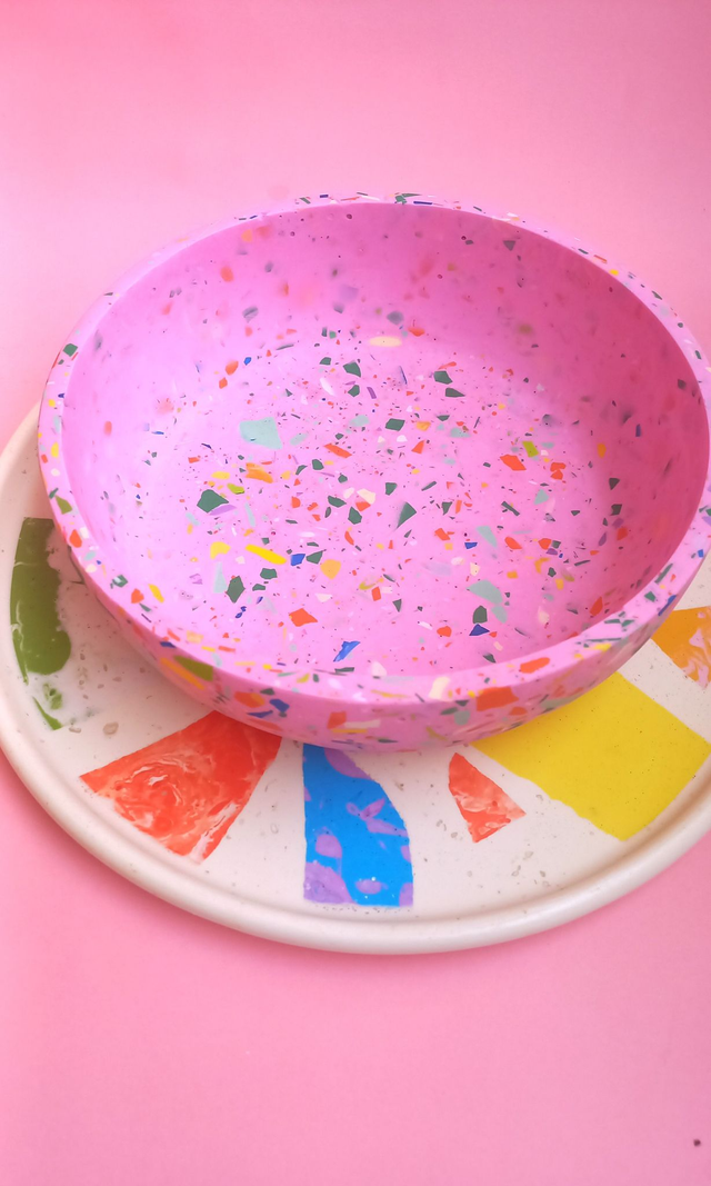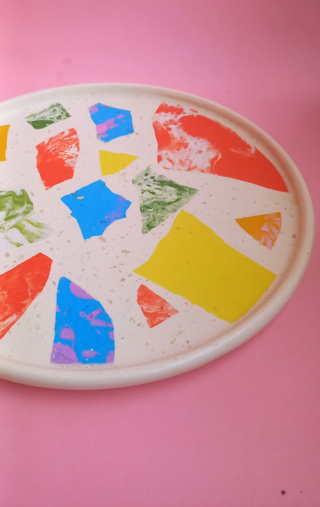 Beżowa taca dekoracyjna to przepiękny, designerski dodatek do salonu i kuchni. Wypełniona jest kolorowym lastryko w pastelowych i mocnych kolorach.