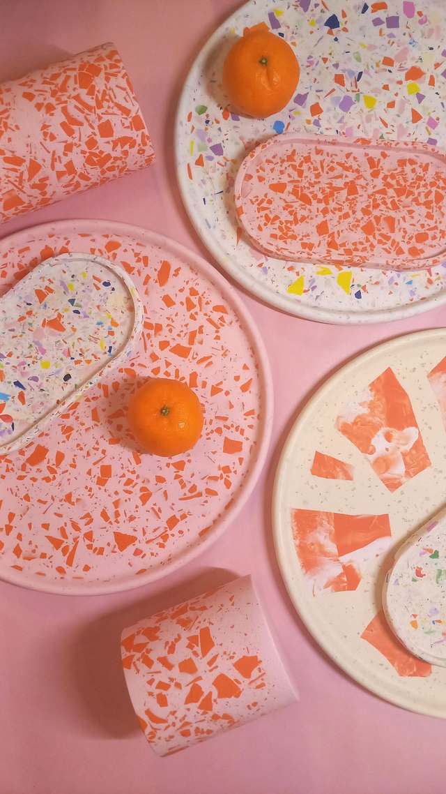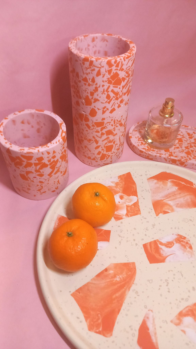 Beżowa taca dekoracyjna, pomarańczowe lastryko, okrągła taca kawowa, 27 cm