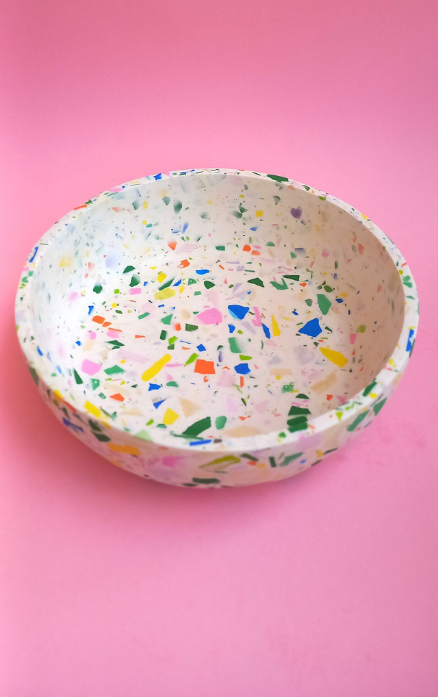 Duża misa na owoce/przekąski/dekoracje z wzorem terrazzo to idealny dodatek do każdej nowoczesnej kuchni lub salonu. Wielokolorowy, unikatowy wzór będzie przepiękną ozdobą Twojej kuchni i jadalni, która zaskoczy Twoich gości.