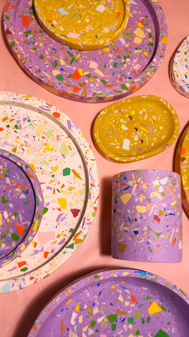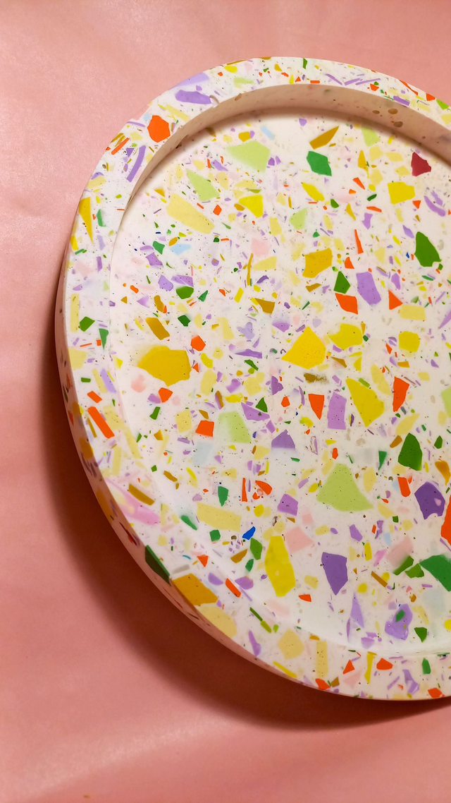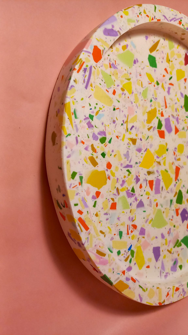 Biała taca dekoracyjna z grubym rantem to przepiękny, designerski dodatek do salonu i kuchni. Wypełniona jest kolorowym lastryko w pastelowych i mocnych kolorach.