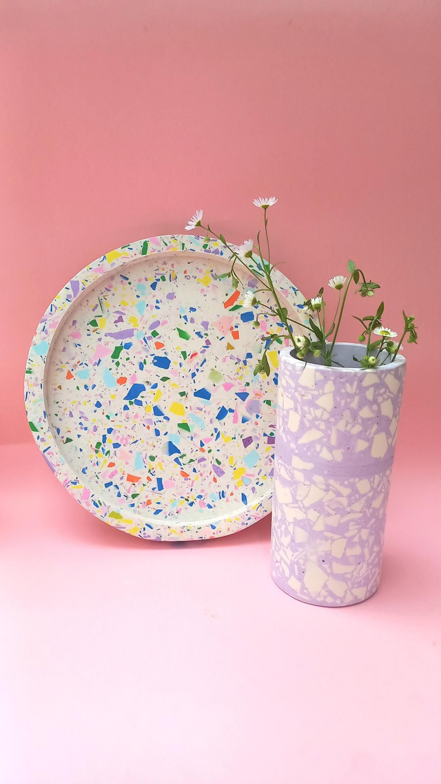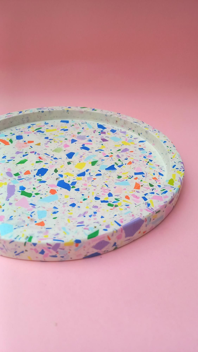 Biała taca dekoracyjna z grubym rantem to przepiękny dodatek do salonu i kuchni. Wypełniona jest kolorowym lastryko w pastelowych i mocnych kolorach.