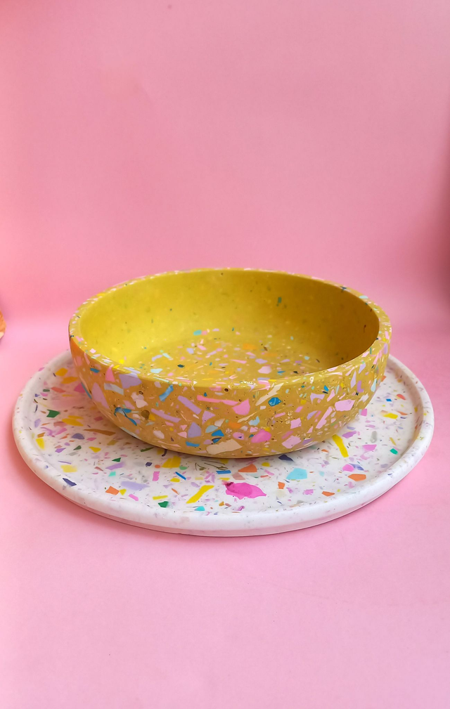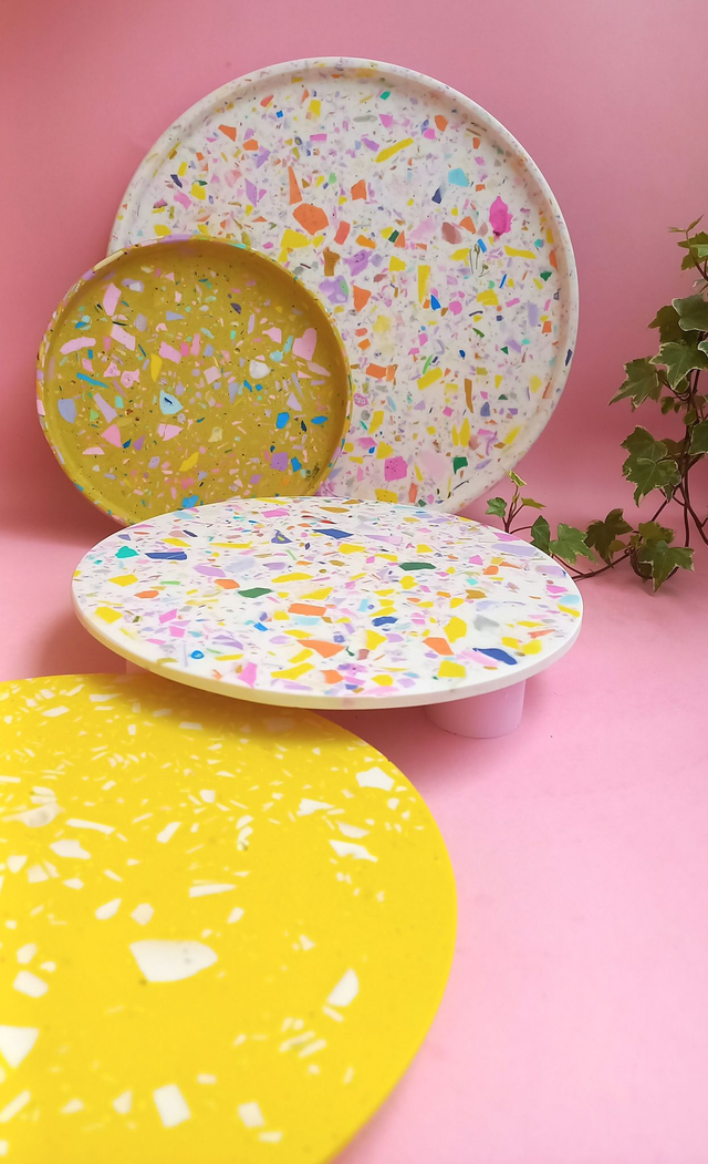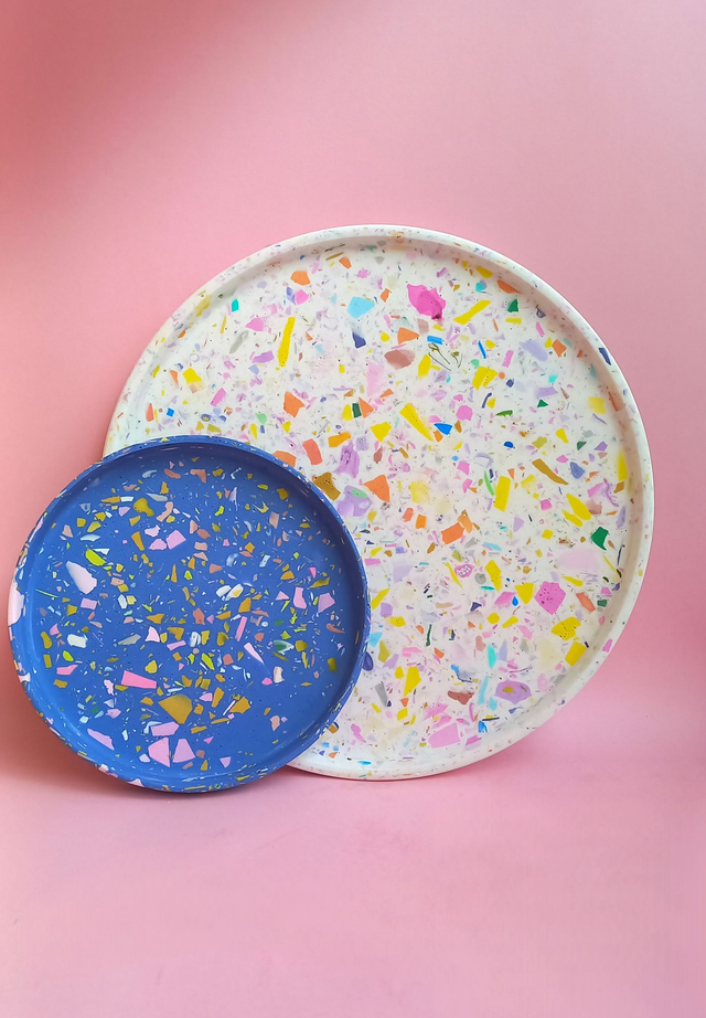 Biała taca dekoracyjna to przepiękny dodatek do salonu i kuchni. Wypełniona jest kolorowym lastryko w pastelowych i mocnych kolorach. Okrągła, duża taca sprawdzi się jako taca do serwowania kawy lub innych napojów. Spełni również funkcję jako podstawka pod świece, doniczki z ukochanymi roślinami lub kosmetyki i flakoniki perfum.