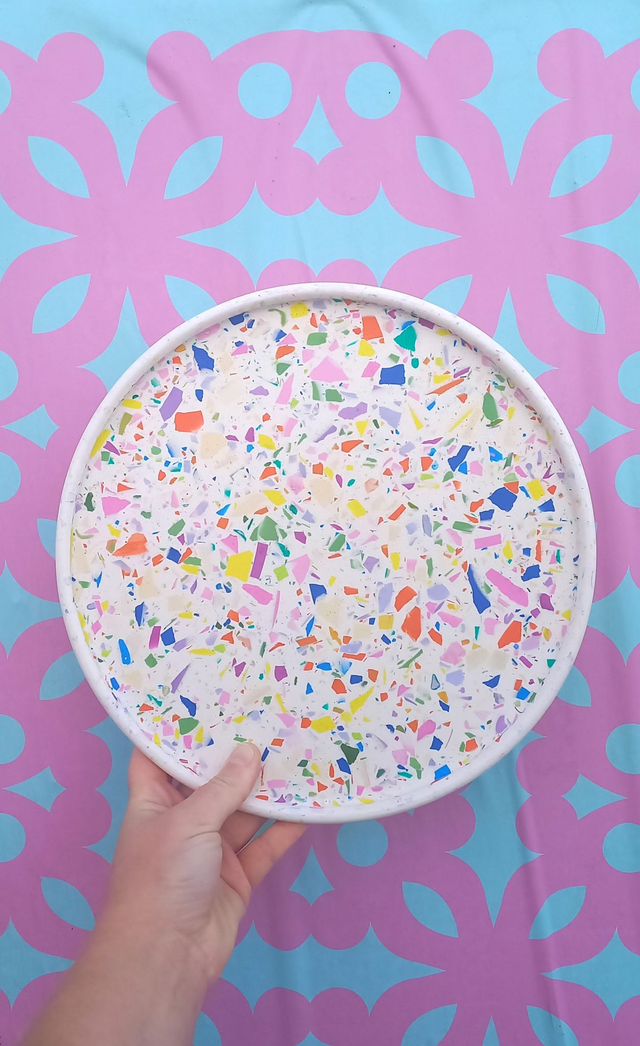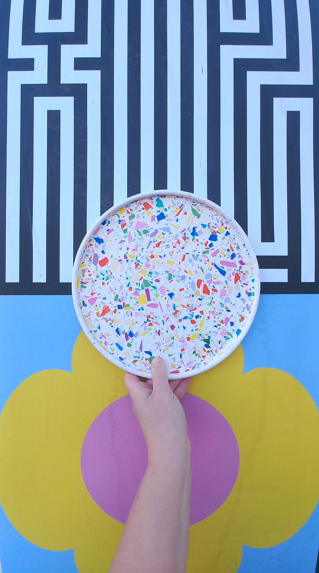 Beżowa taca dekoracyjna to przepiękny, designerski dodatek do salonu i kuchni. Wypełniona jest kolorowym lastryko w pastelowych i mocnych kolorach.