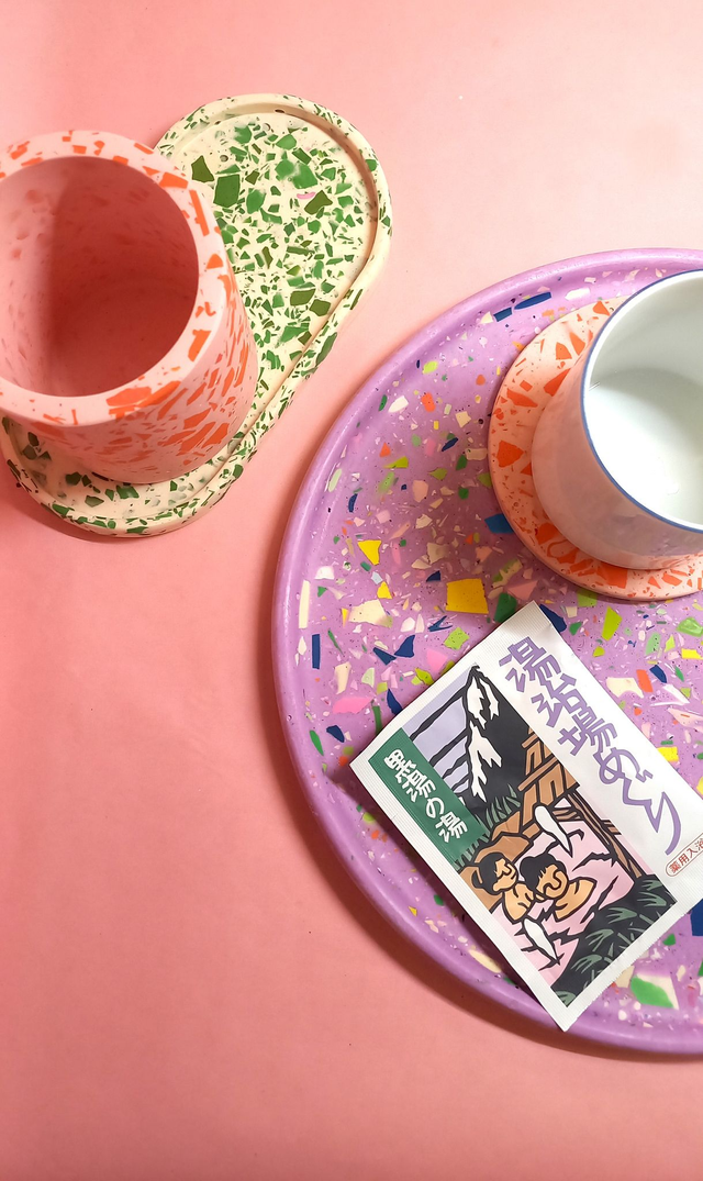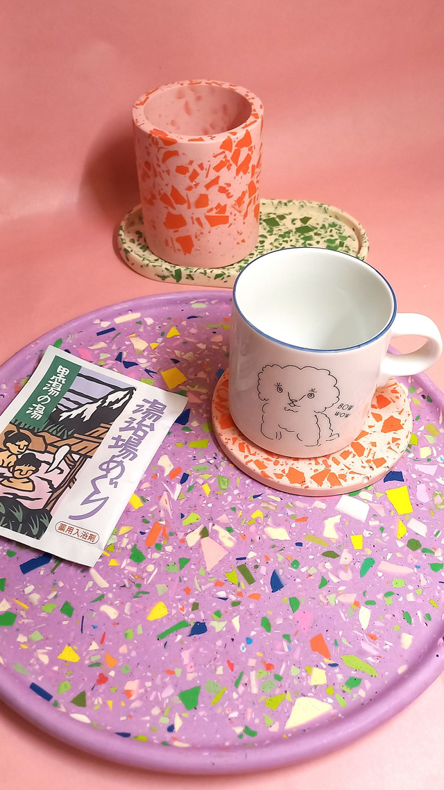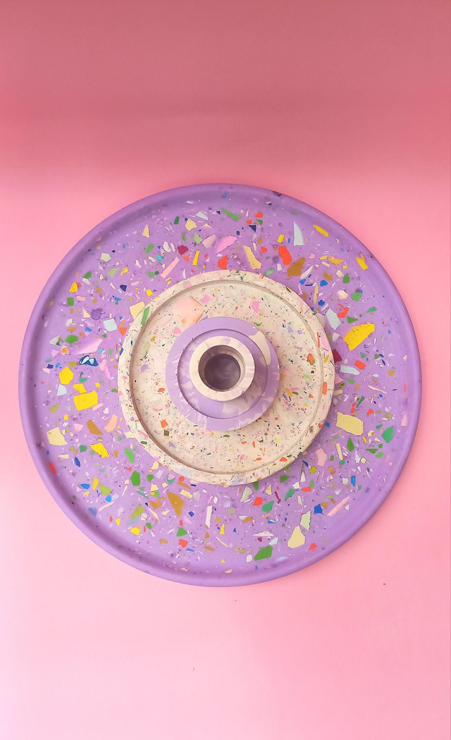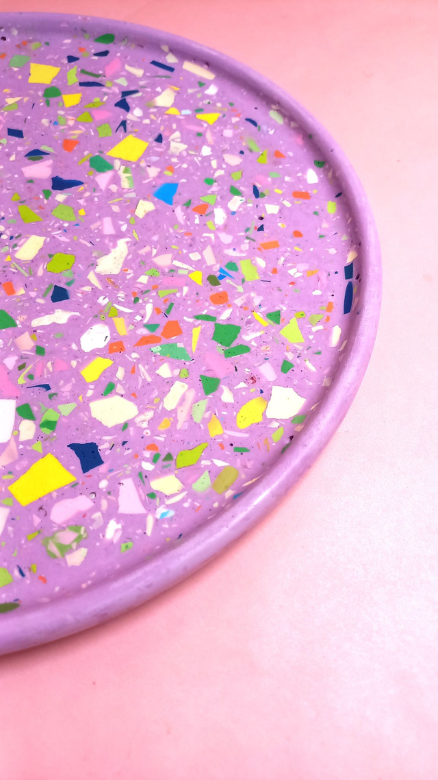 Beżowa taca dekoracyjna to przepiękny, designerski dodatek do salonu i kuchni. Wypełniona jest kolorowym lastryko w pastelowych i mocnych kolorach.
