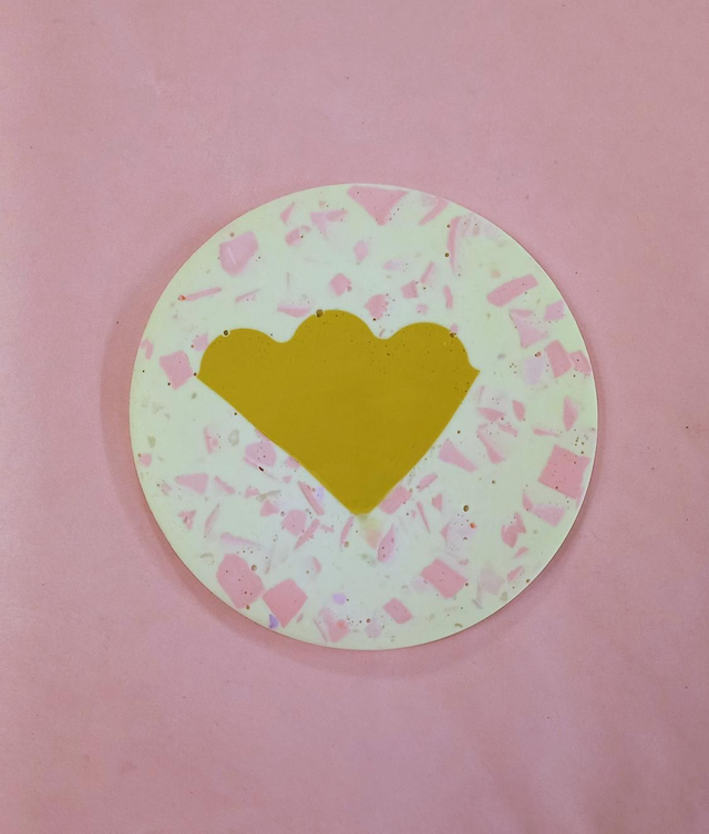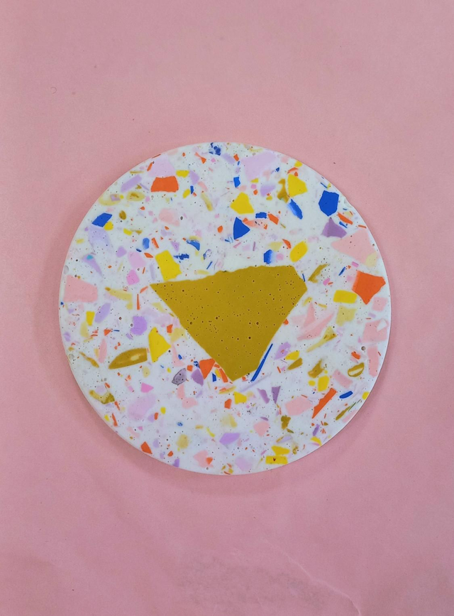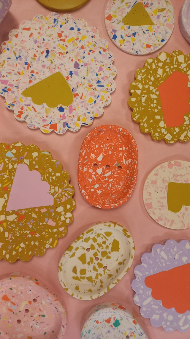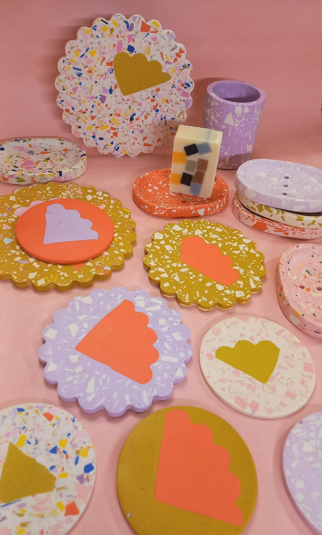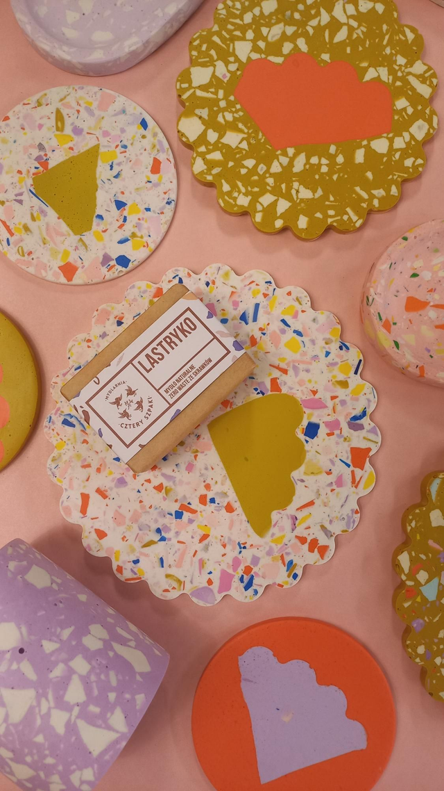 Podkładki pod kubki w radosny wzór i ten element kwiatka, który przywołuje lato. Wypełniona jest oczywiście lastryko w pastelowych i mocnych kolorach.