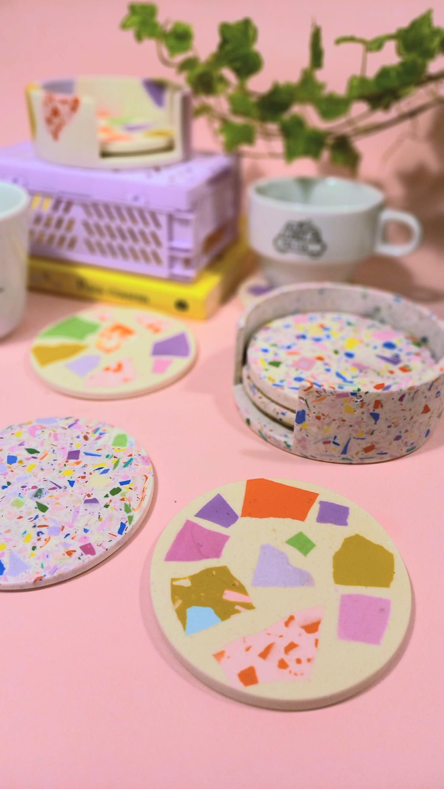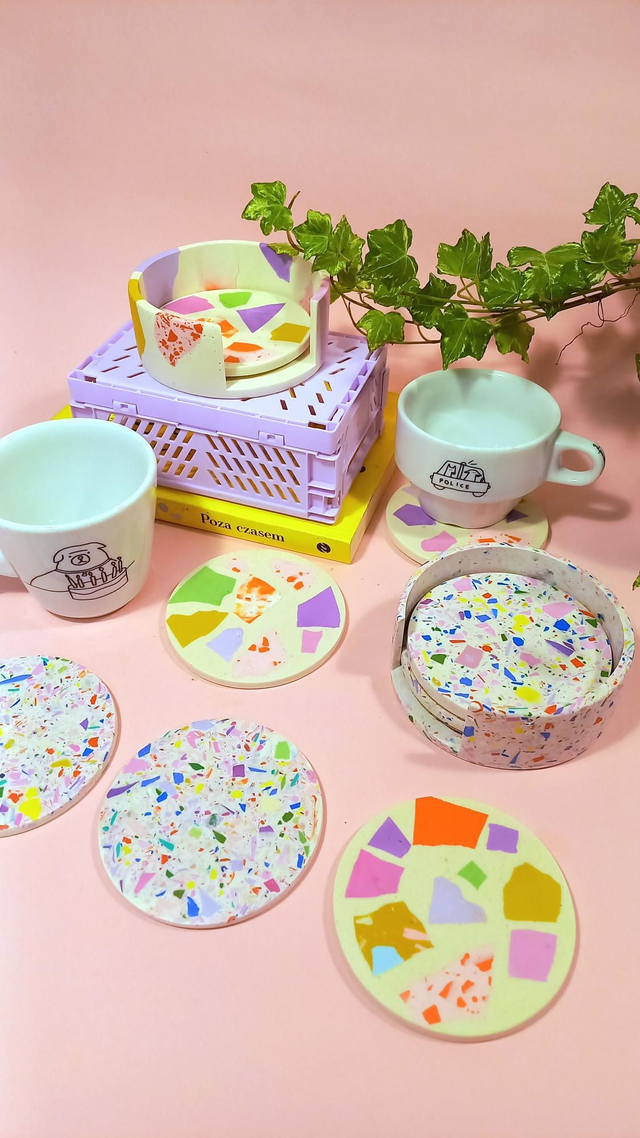 Przepięknie kolorowe ręcznie robione podkładki pod kubek z opcjonalnym organizerem. Dodają totalnego blasku i radości pomieszczeniom. Idealne na prezent dla siebie lub kogoś komu chcesz sprawić radość.