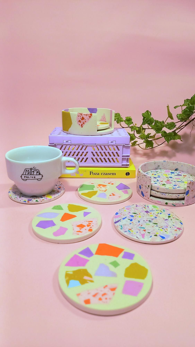 Kolorowa podkładka pod kubek, okrągła, organizer, biała, duże lastryko, 9 cm