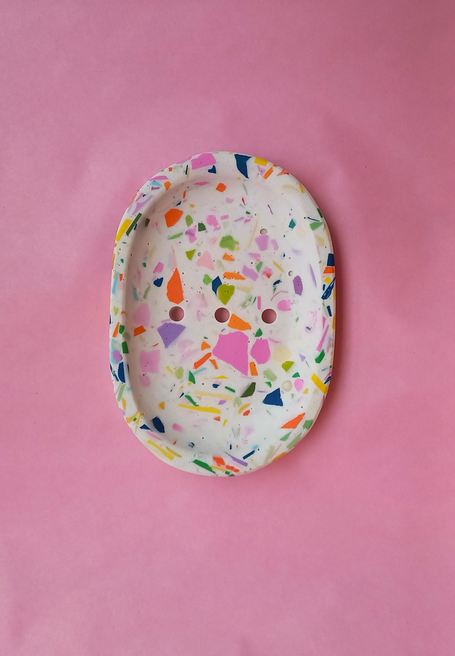 Mydelniczka terrazzo to idealne rozwiązanie do przechowywania mydła w sposób higieniczny. Otwory odprowadzające wodę sprawiają, że mydło nie rozpuszcza się, a powierzchnia pozostaje sucha i czysta. Dzięki solidnej konstrukcji, mydelniczka jest odporna na zarysowania i uszkodzenia, co zapewnia jej długotrwałe użytkowanie.