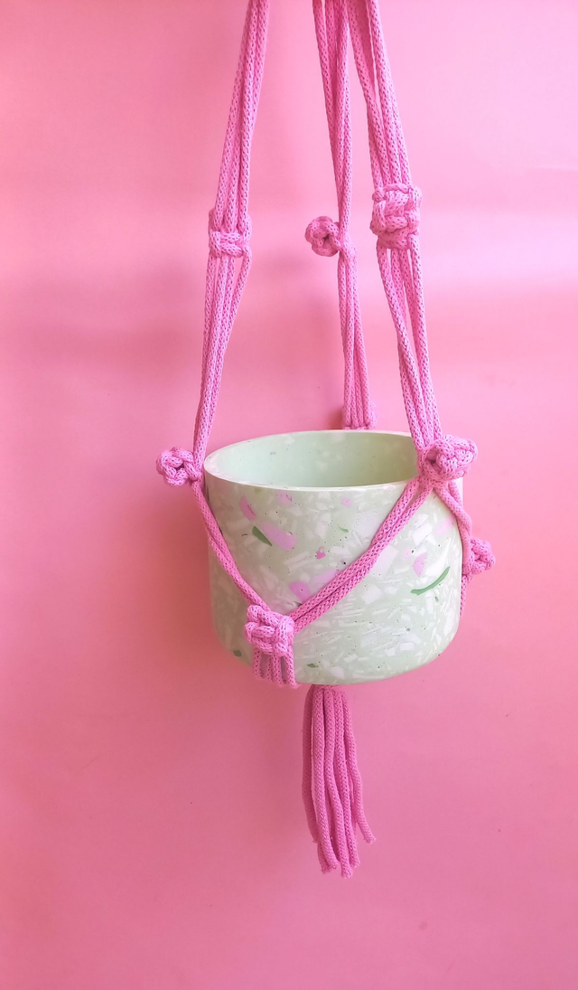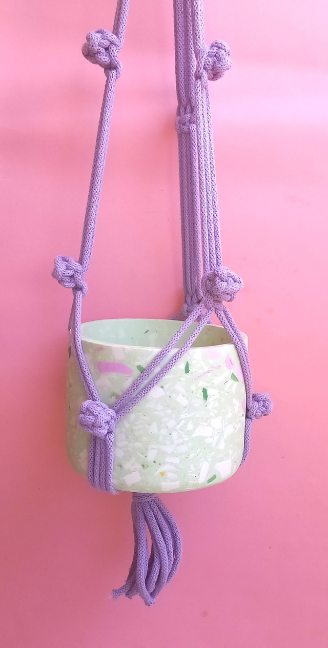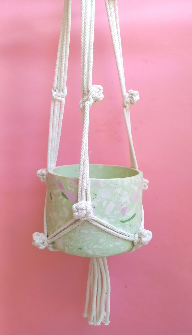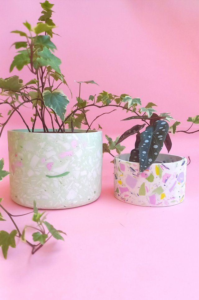 Osłonka na doniczkę terazzo to przepiękny, unikatowy dodatek do mieszkania. Z łatwością zasadzisz w niej monsterę, ficusa, dracenę lub inną, średnia lub dużą roślinę! Ta doniczka dzięki obłemu dnu idealnie nadaje się do podwieszenia na makramie.