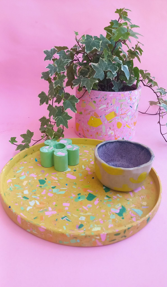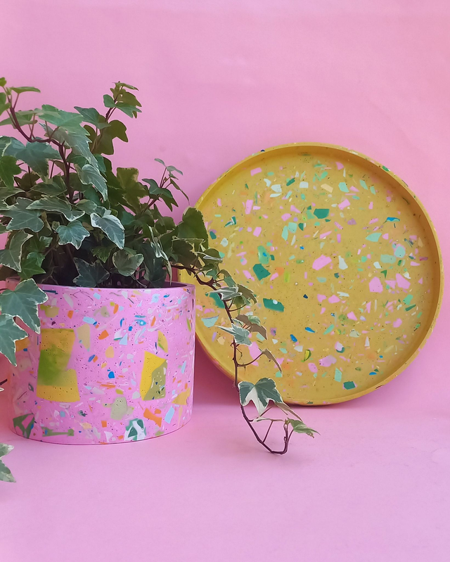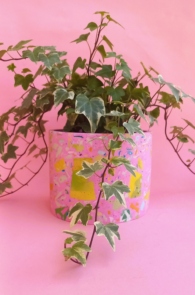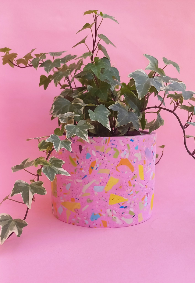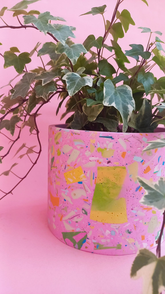 Osłonka na doniczkę terazzo to przepiękny, unikatowy dodatek do mieszkania. Z łatwością zasadzisz w niej monsterę, ficusa, dracenę lub inną, średnia lub dużą roślinę!