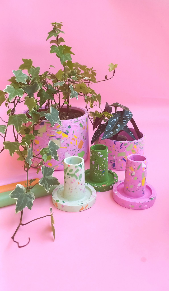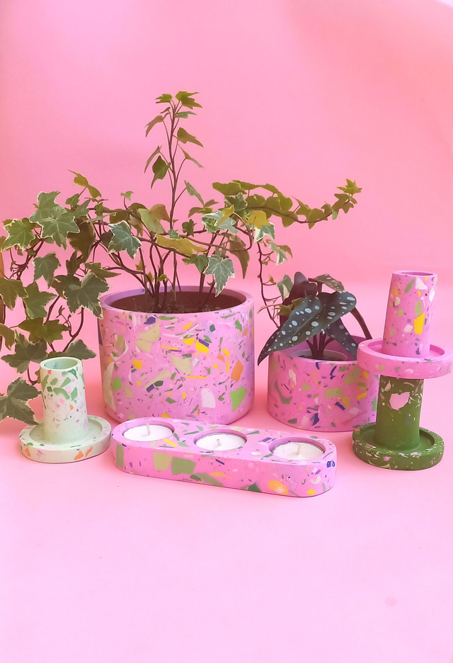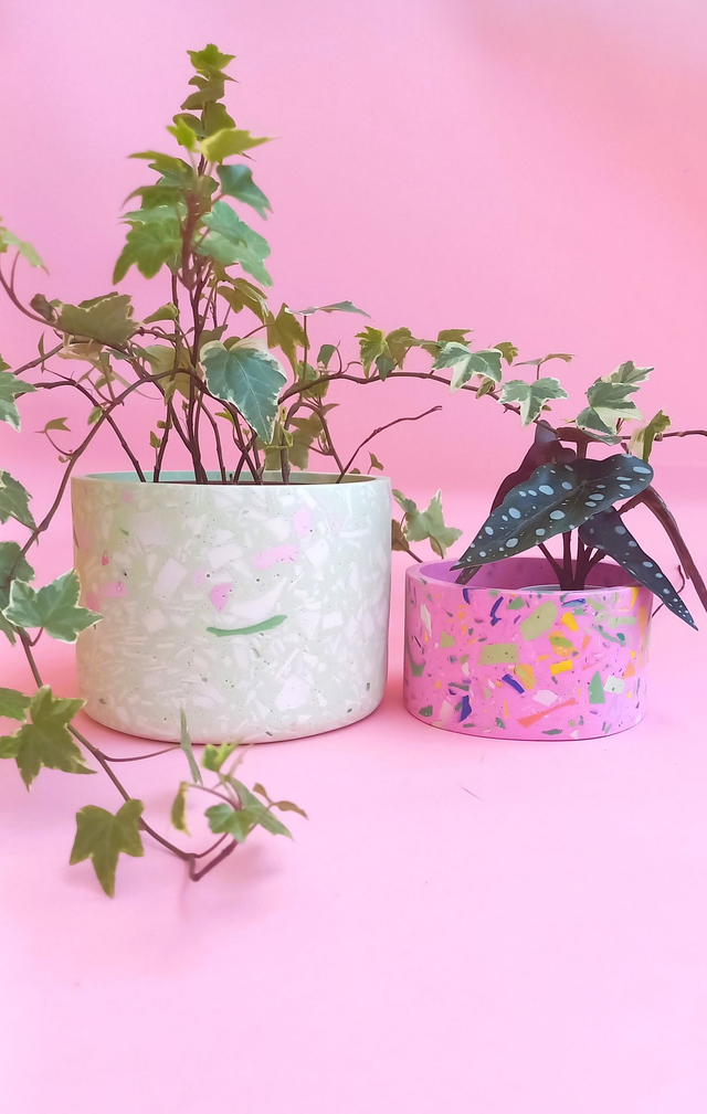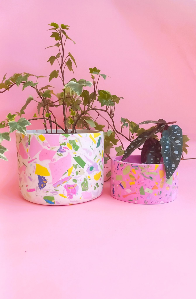 Różowa osłonka na doniczkę / pojemnik terazzo to przepiękny i unikatowy dodatek do mieszkania.