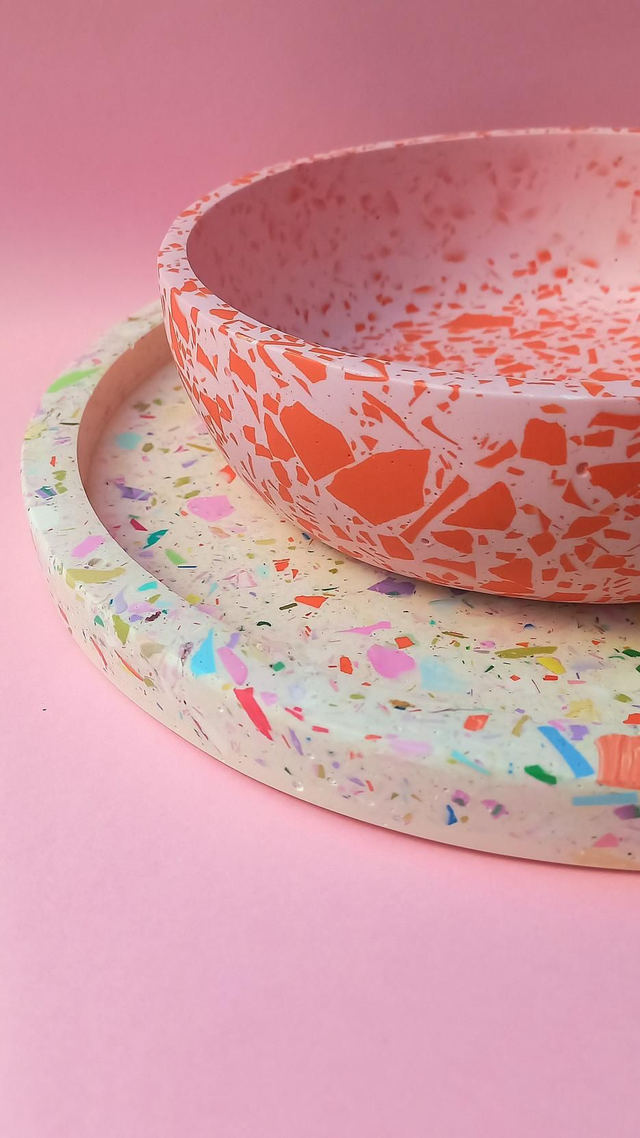 Duża misa na owoce/przekąski/dekoracje z wzorem terrazzo to idealny dodatek do każdej nowoczesnej kuchni lub salonu. Jej ciepły, unikatowy wzór będzie przepiękną ozdobą Twojej kuchni i jadalni, która zaskoczy Twoich gości.