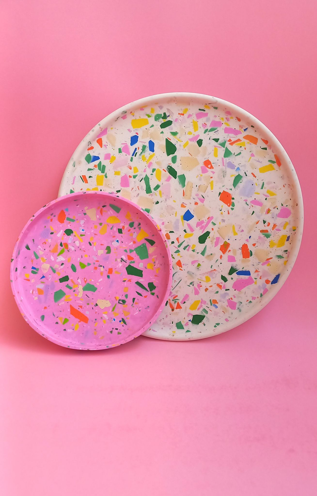Podstawka we wzór terrazzo to doskonały przedmiot pod doniczkę (jako kwietnik, stojak na rośliny) lub na stół serwowania przekąsek. Dodaj koloru w swojej domowej dżungli lub poukładaj na niej w małych talerzykach tapas i inne przekąski. Jej wspaniały kolor z pewnością rozświetli Twoje wnętrze!