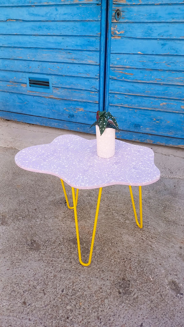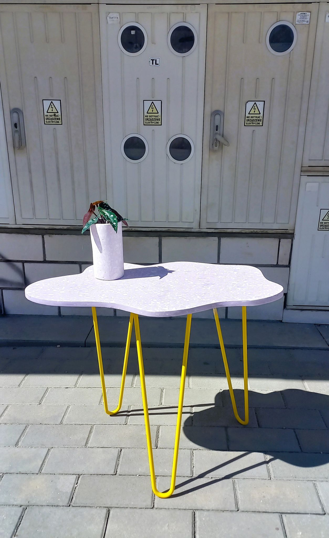 Stolik kawowy w kształcie chmurki, który pokochasz. Znajdziesz dla niego zastosowanie jako stolik boczny, stolik do salonu, na balkon, stojak na rośliny. Posiada cudowne kolory lastryko, terrazzo oraz stylowe, metalowe nogi. Jego nieregularny kształt chmury dodaje pozytywnego uroku!