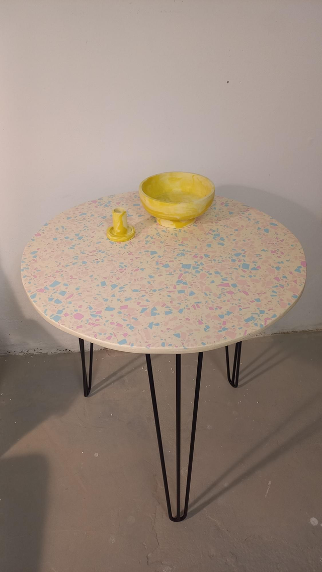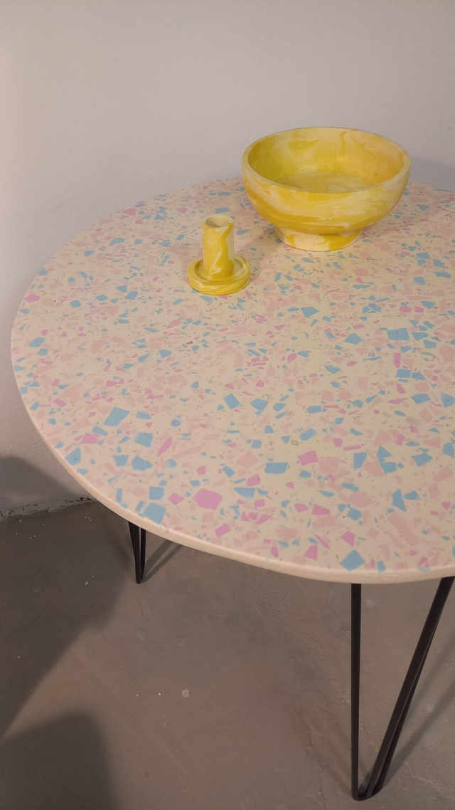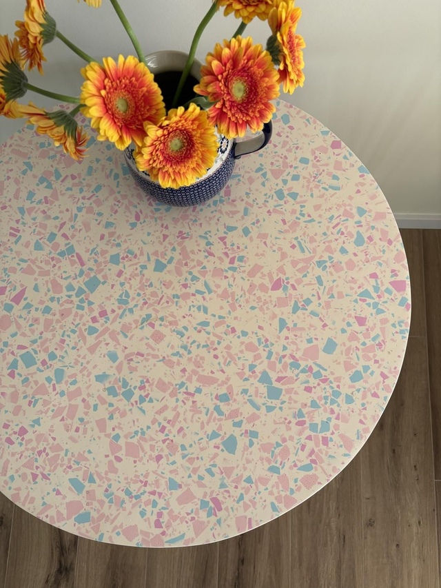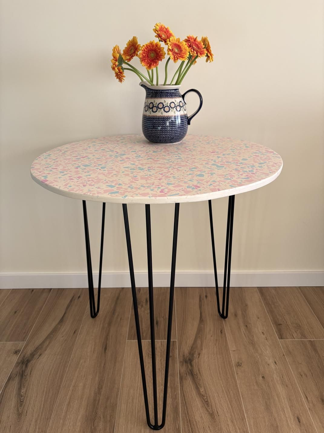 Stolik kawowy, który pokochasz. Znajdzie zastosowanie jako stolik boczny, stolik do salonu, na balkon, stojak na rośliny. Posiada cudowne kolory lastryko, terrazzo oraz stylowe, metalowe nogi. Pasuje do każdego wnętrza.