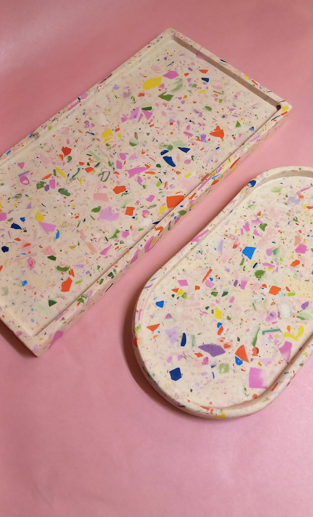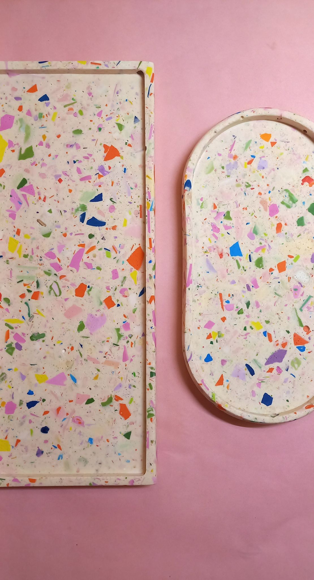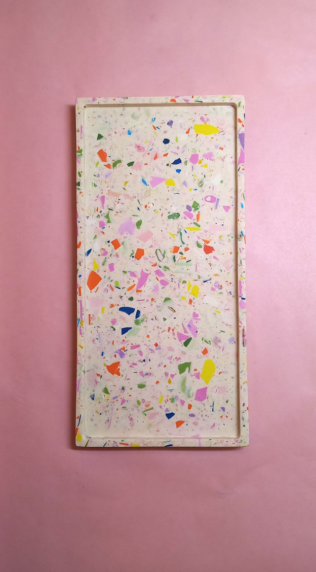 Długa podstawka terrazzo lub marble na akcesoria do kuchni, łazienki, salonu. Ułóż na niej przyprawniki, akcesoria łazienkowe, biżuterię, świece lub przekąski. Ma wiele zastosowań, będzie wyjątkową dekoracją nowoczesnego wnętrza. Sprawdzi się jako wyjątkowy, oryginalny prezent dla każdego kto lubi tworzyć wokół siebie miły nastrój.
