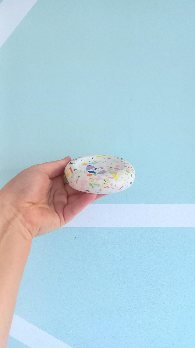 Talerz na drobną biżuterię, który swoją formą przypomina pulchnego pączka z obłymi krawędziami.
