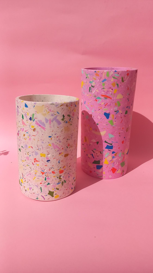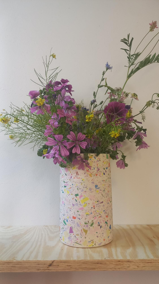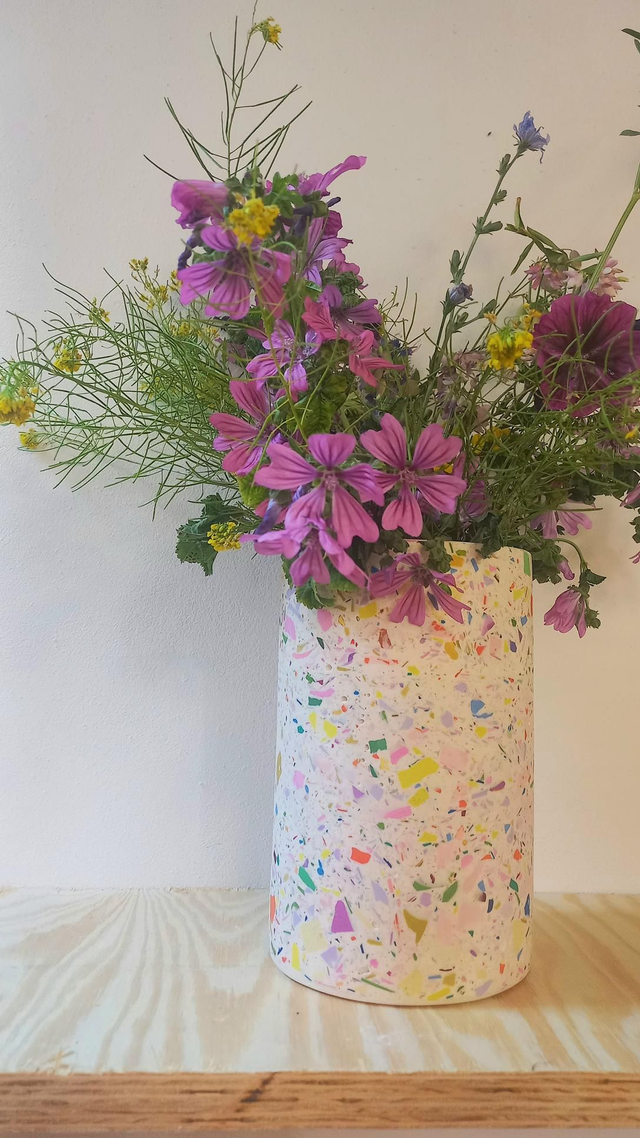 Wazon w kolorowy wzór lastryko na kwiaty i bukiety. Spełnia również zastosowanie jako okrągły pojemnik do przechowywania i organizacji akcesoriów.
