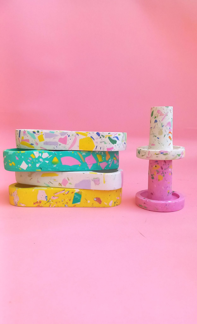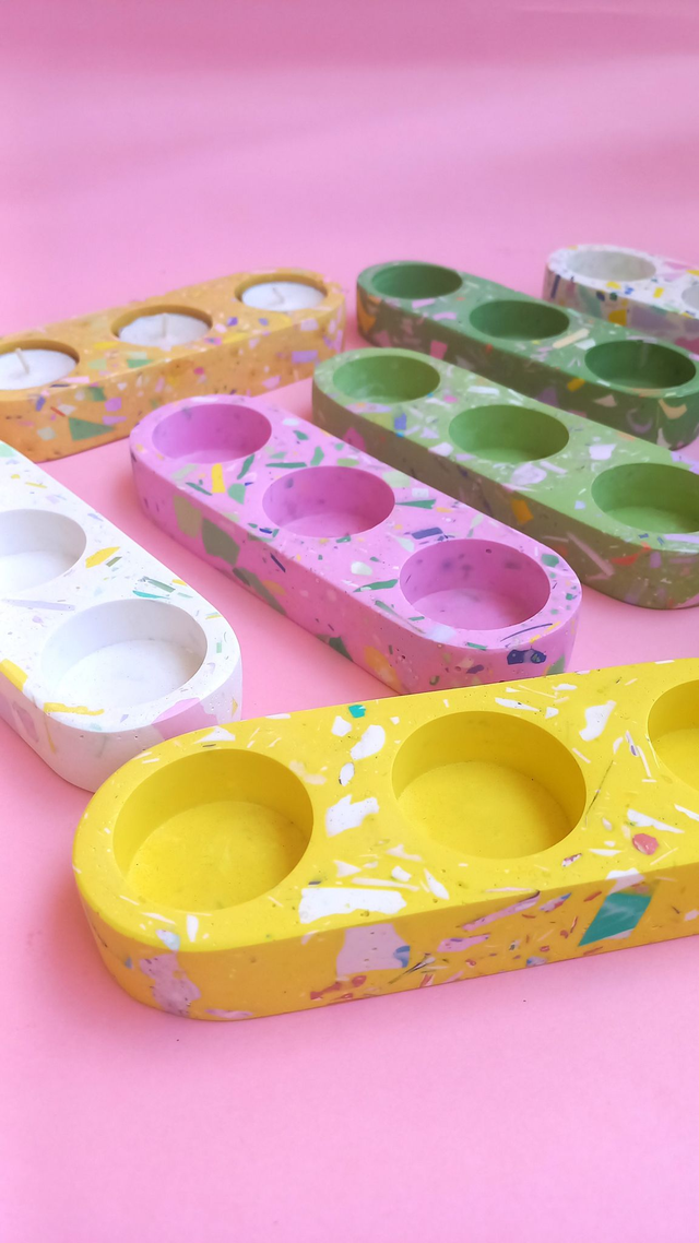 Dekoracyjny świecznik z multikolorowym lastryko to przepiękny, designerski przedmiot do salonu i kuchni. Jego barwne lastryko przypomina` kolory jak w kalejdoskopie!